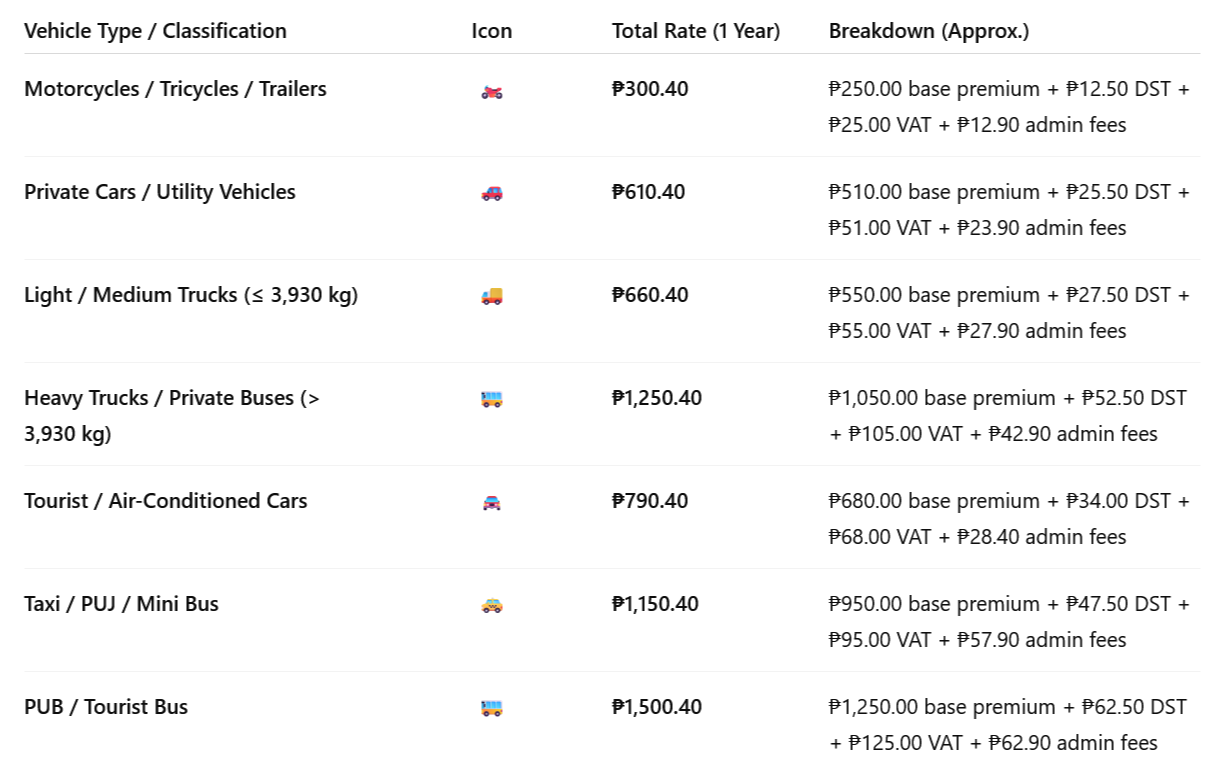 Together, these components make up the total CTPL premium that vehicle owners pay when registering or renewing their motor vehicle insurance in the Philippines.