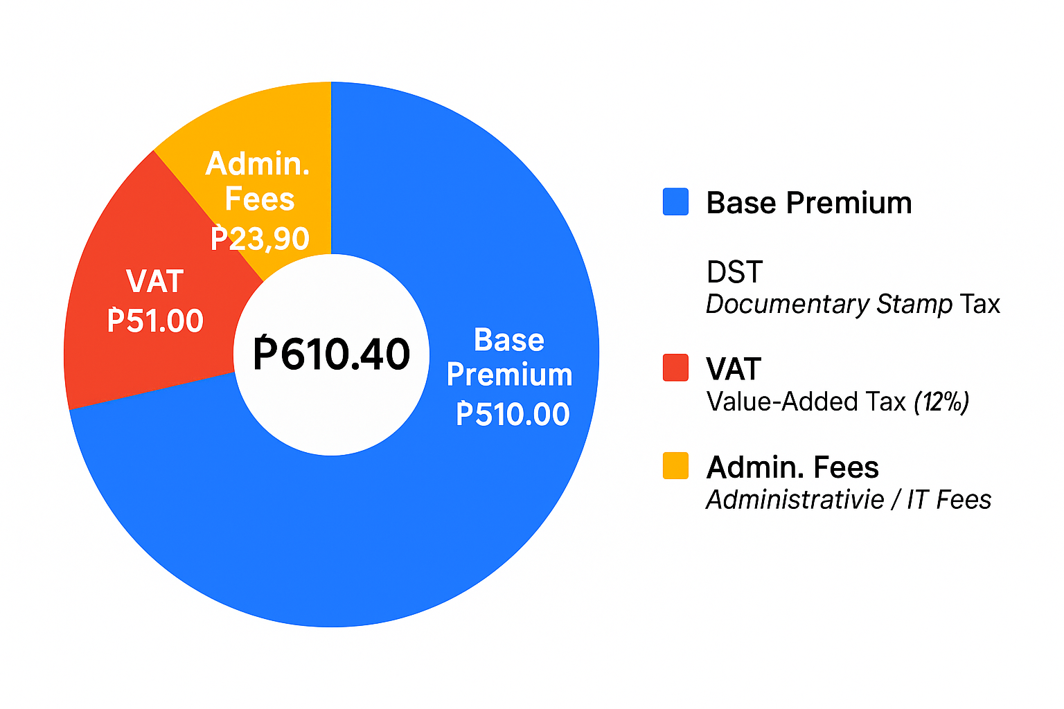 Value-Added Tax (VAT, 12%) – The standard 12% sales tax imposed on the premium and related service components. This amount is remitted to the Bureau of Internal Revenue (BIR).