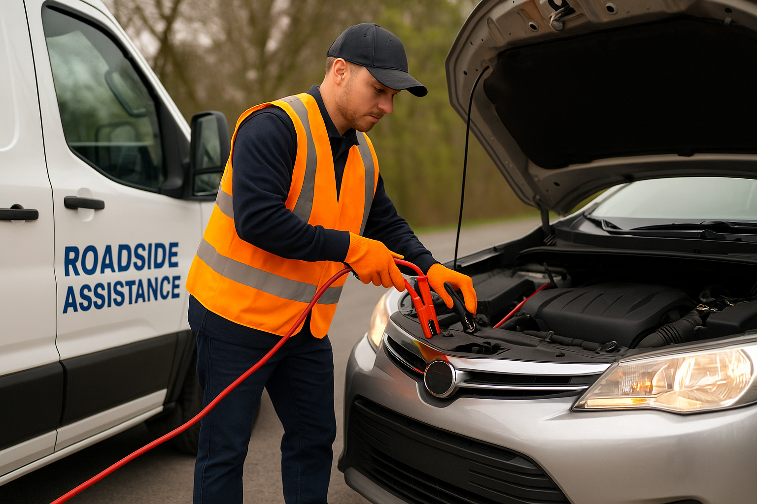 Battery jump-start / boosting when your car won’t start due to a dead battery.